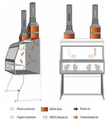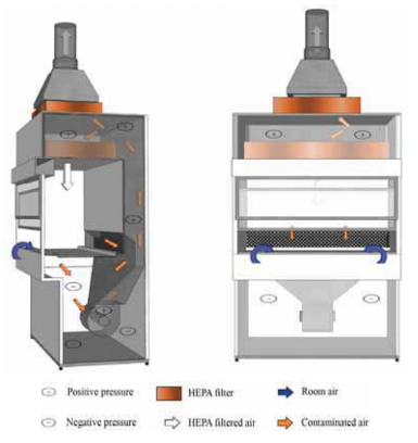 - 전면 그릴 및 일정비율의 BSC 내 재순환 공기를 전면 그릴에서 빨아들인 후, 작업면 밑에 위치한 헤파필터를 통해 바로 보내는 형태