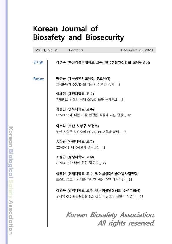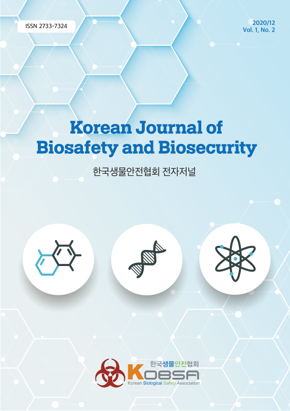 한국생물안전협회 전자저널 1권 2호 (2020.12) 작성자 홈페이지 관리자 조회 2,912 작성일 2021-06-15 안녕하세요. 한국생물안전협회입니다. 한국생물안전협회 전자저널 1권 2호를 안내드립니다. # 한국생물안전협회 전자저널 표지 및 목차 첨부파일 한국생물안전협회 전자저널 1권 2호(배포용).pdf 이전글 다음글 목록