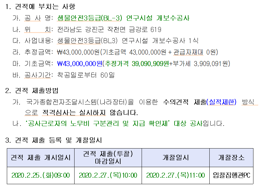 [나라장터] 전라남도 BL3 개보수공사 수의견적 안내 (2020.02.25~27)