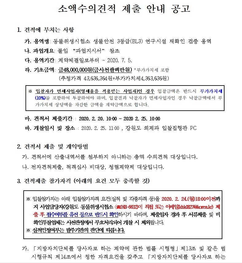 강원도 공고 제 2020-137호 "동물위생시험소 생물안전 3등급(BL3) 연구시설 재확인 검증 용역"을 안내드립니다.