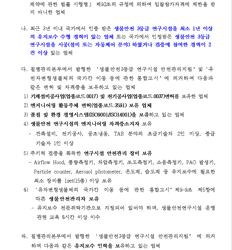 <나라장터 공고 바로가기 하신 뒤 동물위생시험소 생물안전 3등급(BL3) 연구시설 재확인 검증 용역 검색>