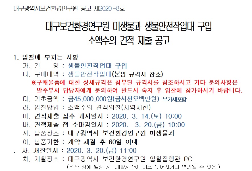 [나라장터] 대구보건환경연구원 생물안전작업대 구입 소액수의 견적 제출 공고 (2020.03.14~20)