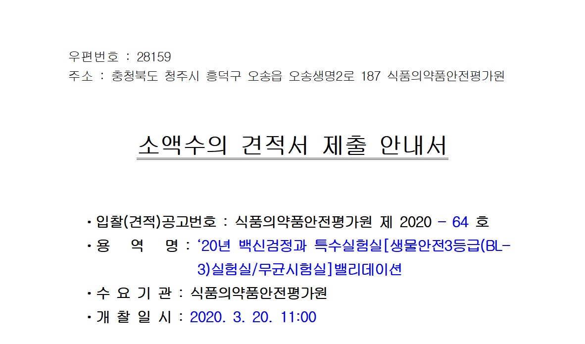 [나라장터] 백신검정과 특수실험실[생물안전3등급(BL-3)실험실/무균실험실]밸리데이션 용역 (2020.03.16~19)