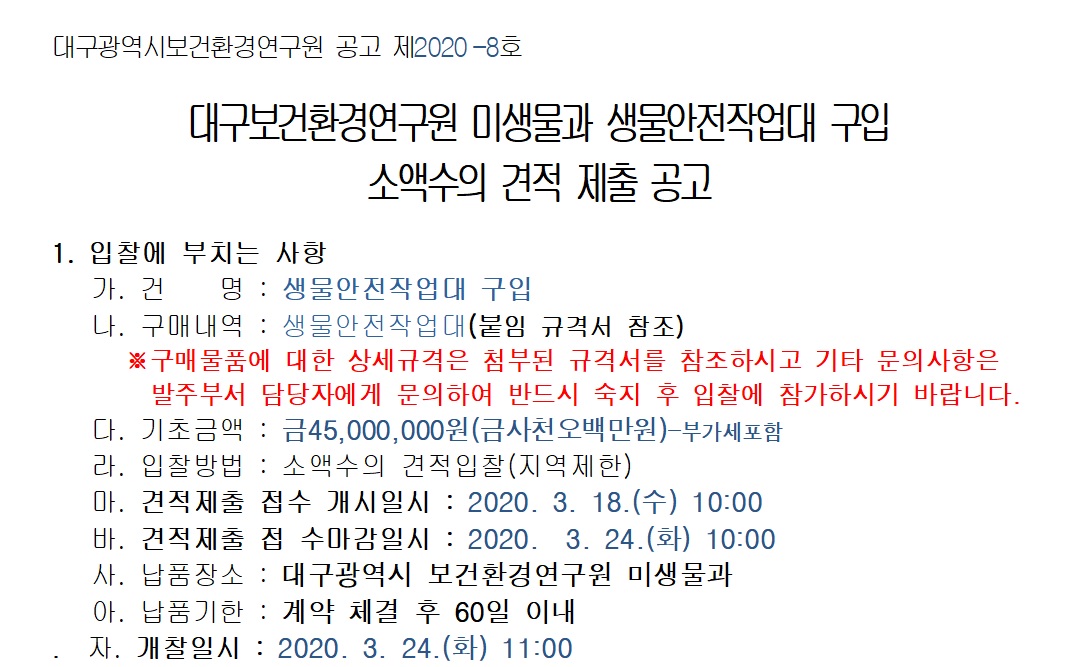 [나라장터] 대구보건환경연구원 생물안전작업대 구입 소액수의 견적 입찰공고 (2020.03.18-2020.03.24) 작성자 최고관리자 조회 342 작성일 2020-03-18 안녕하세요. 한국생물안전협회입니다. 대구광역시보건환경연구원 공고 20200332295-00 생물안전작업대 구입 소액수의 견적 입찰공고를 안내드립니다. 감사합니다. 이전글 다음글 목록