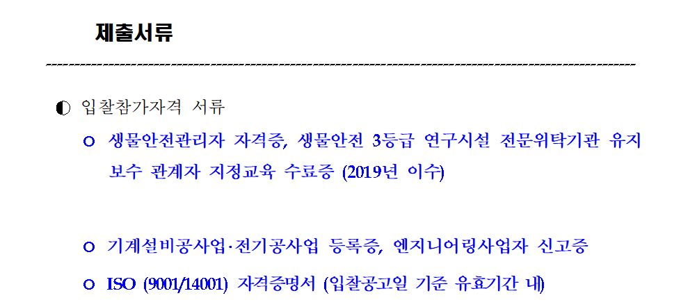 [나라장터] 생물안전연구동 관리 및 운영 용역 (05.06 ~ 05.08) 작성자 최고관리자 조회 295 작성일 2020-03-26 안녕하세요. 한국생물안전협회입니다. 조달청 용역 공고 "20200344251-00" 생물안전연구동 관리 및 운영 용역을 안내드립니다. 나라장터 바로가기 감사합니다. 이전글 다음글 목록