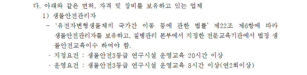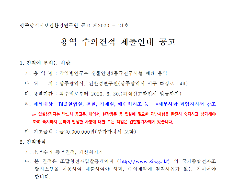 [나라장터] 감염병연구부 생물안전3등급연구시설 폐쇄 용역 (04.02 ~ 07) 작성자 최고관리자 조회 282 작성일 2020-04-02 안녕하세요. 한국생물안전협회입니다. 광주광역시 보건환경연구원 공고 제2020-21호 감염병연구부 생물안전3등급연구시설 폐쇄 용역 공고를 안내드립니다. 감사합니다. 이전글 다음글 목록