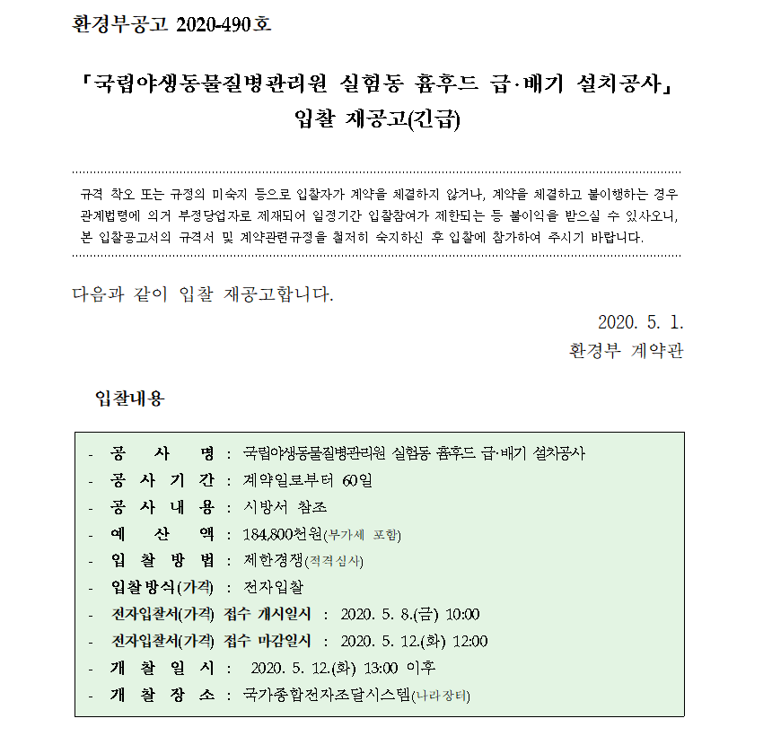 [나라장터] 국립야생동물질병관리원 실험동 흄후드 급배기 설치공사 입찰 재공고(긴급) (5.8 ~ 5.12) 작성자 최고관리자 조회 226 작성일 2020-05-04 안녕하세요. 한국생물안전협회입니다. 환경부공고 2020-490호 국립야생동물질병관리원 실험동 흄후드 급배기 설치공사 입찰 재공고(긴급)를 안내드립니다. 감사합니다. 이전글 다음글 목록