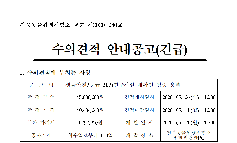 [나라장터] 생물안전 3등급 연구시설 재확인 검증 용역(긴급) (05.06~05.11) 작성자 최고관리자 조회 234 작성일 2020-05-06 안녕하세요. 한국생물안전협회입니다. 전북동물위생시험소 공고 제 2020-040호 생물안전3등급(BL3)연구시설 재확인 검증 용역(긴급)을 안내드립니다. 감사합니다. 나라장터 바로가기 이전글 다음글 목록