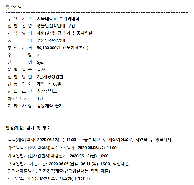[나라장터] 서울대학교 수의과대학 생물안전작업대 구매 입찰공고(~6.11) 작성자 최고관리자 조회 226 작성일 2020-06-08 안녕하세요. 한국생물안전협회입니다. 서울대학교 수의과대학 생물안전작업대 구매 입찰공고를 안내드립니다. [나라장터 바로가기] 감사합니다. 이전글 다음글 목록