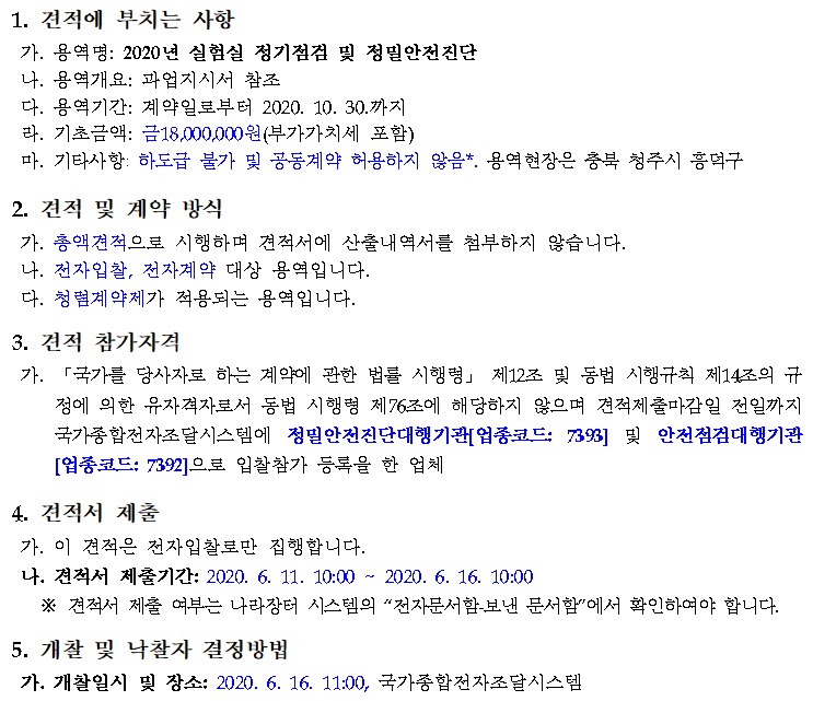 [나라장터] 2020년 실험실 정기점검 및 정밀안전진단(06.11~06.16) 작성자 최고관리자 조회 215 작성일 2020-06-10 안녕하세요. 한국생물안전협회입니다. 질병관리본부 공고 '2020년 실험실 정기점검 및 정밀안전진단' 용역을 안내드립니다. [나라장터 바로가기] 감사합니다. 이전글 다음글 목록