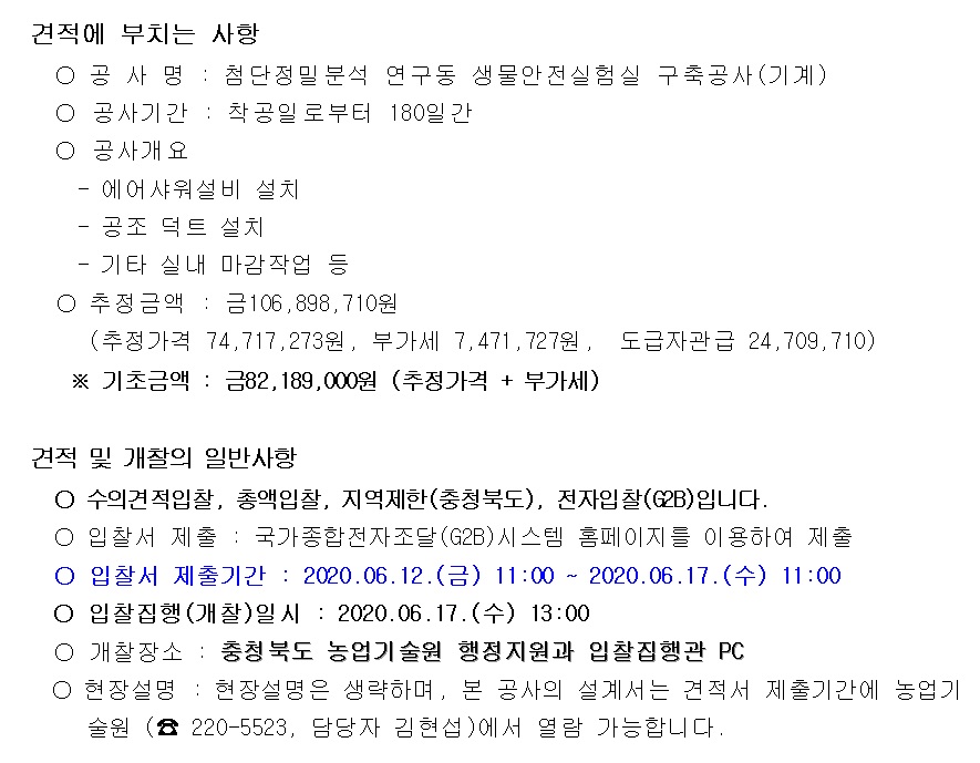 [나라장터] 충북 농업기술원 첨단정밀분석 연구동 생물안전실험실 구축공사(~6.17) 작성자 최고관리자 조회 215 작성일 2020-06-15 안녕하세요. 한국생물안전협회입니다. 충북 농업기술원 첨단정밀분석 연구동 생물안전실험실 구축공사 공고를 안내드립니다. [나라장터 바로가기] 감사합니다. 이전글 다음글 목록
