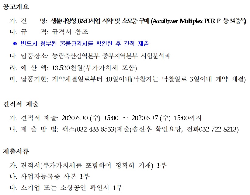 [농림축산검역본부] 생물다양성 R&D사업 관련 소모품 구매 견적공고(~06.17) 작성자 최고관리자 조회 212 작성일 2020-06-15 안녕하세요. 한국생물안전협회입니다. 농림축산검역본부 생물다양성 R&D사업 관련 소모품 구매 견적공고를 안내드립니다. 감사합니다. [출처 : 농림축산검역본부] 이전글 다음글 목록