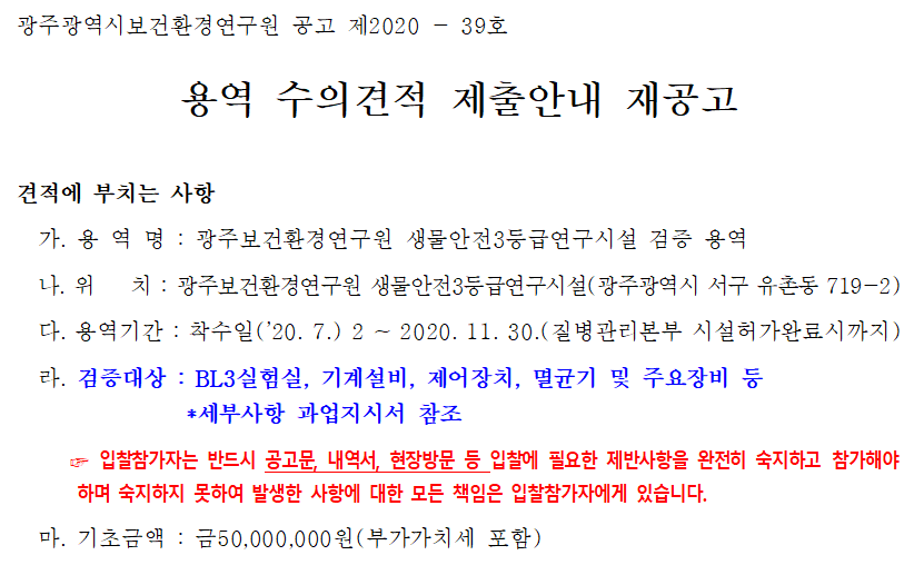 [나라장터] 광주보건환경연구원 생물안전 3등급 연구시설 검증 용역(~7.7) 작성자 최고관리자 조회 240 작성일 2020-06-24 안녕하세요. 한국생물안전협회입니다. 광주보건환경연구원 생물안전 3등급 연구시설 검증 용역을 안내드립니다. [나라장터 바로가기] 감사합니다. 이전글 다음글 목록