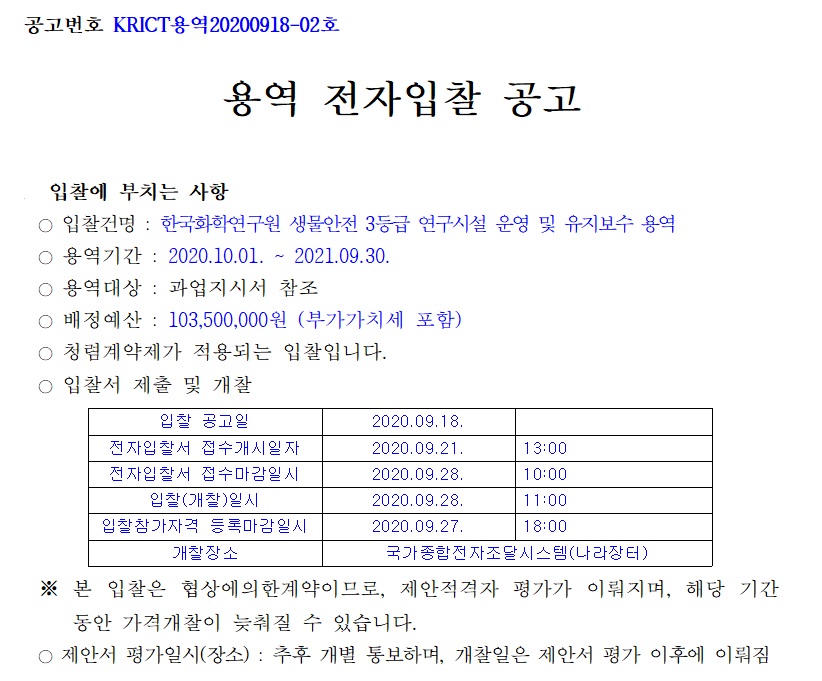 [나라장터] 한국화학연구원 생물안전 3등급 연구시설 운영 및 유지보수 용역 작성자 최고관리자 조회 226 작성일 2020-09-22 안녕하세요. 한국생물안전협회입니다. 한국화학연구원 생물안전 3등급 연구시설 운영 및 유지보수 용역을 안내드립니다. [나라장터 바로가기] 감사합니다. 이전글 다음글 목록