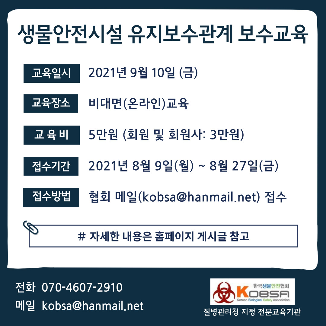 [교육공지] 2021년 2차 생물안전시설 유지보수관계자 보수교육 안내(~8.27까지 접수)