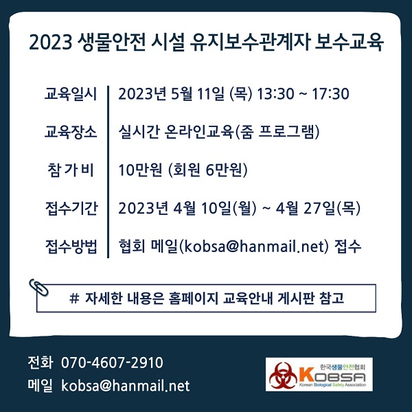 2023년 생물안전 시설 유지보수관계자 보수교육을 안내하오니 많은 관심과 참여 바랍니다.