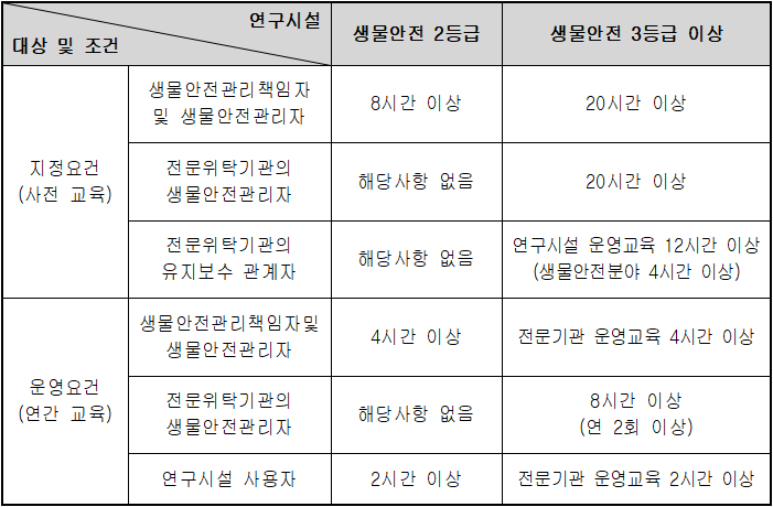 * 교육시간 관련 자세한 사항은 유전자변형생물체법 통합고시 9-9조와 별표9-9 참고