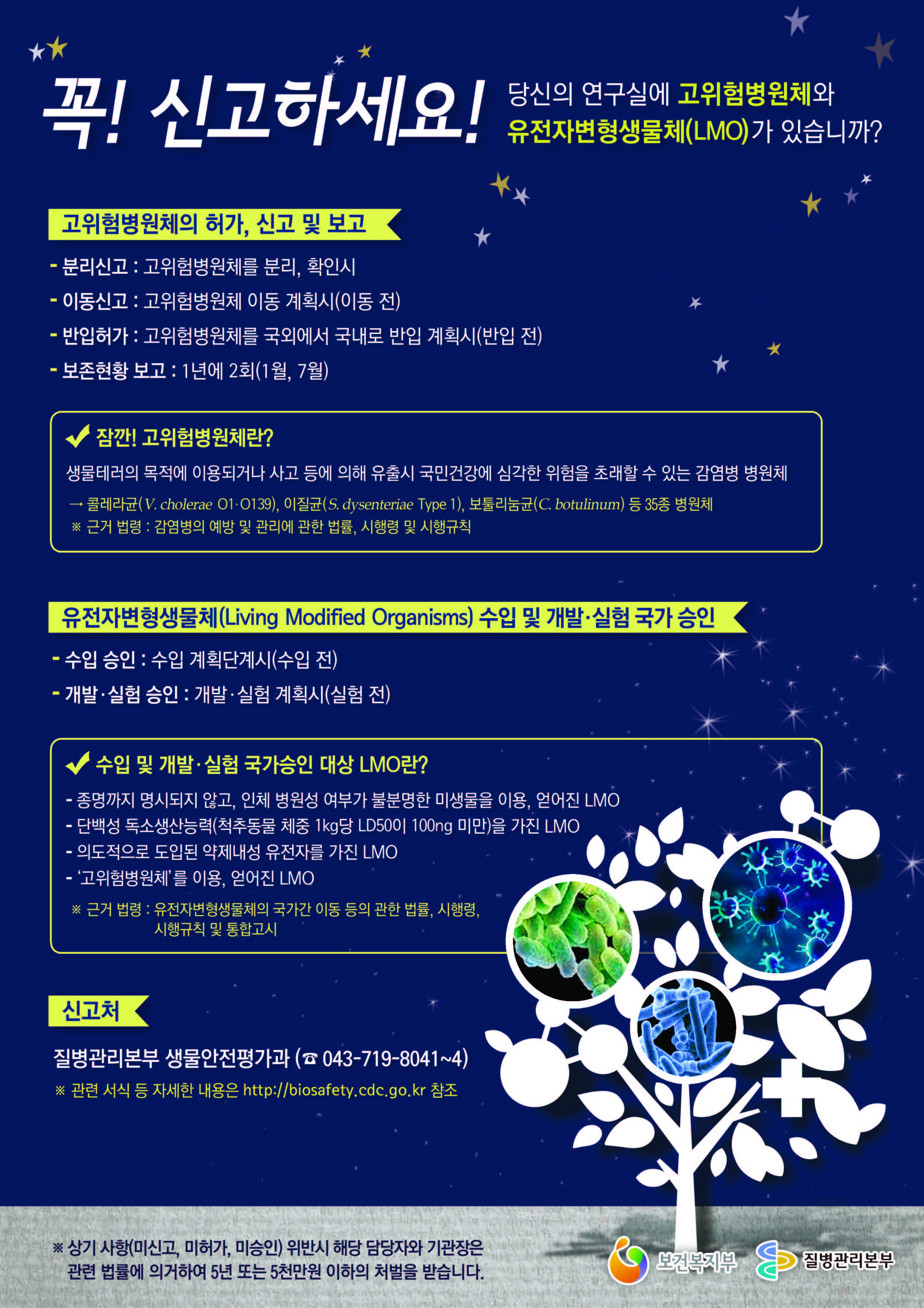 [홍보] 고위험병원체 및 유전자변형생물체 국가관리제도 작성자 KOBSA 조회 2,770 작성일 2013-12-23 [질병관리본부] 고위험병원체 및 유전자변형생물체 국가관리제도 홍보자료입니다. 첨부파일 2013.12.23 고위험병원체 및 유전자변형생물체 국가관리제도 홍보 포스터.jpg 이전글 다음글 목록