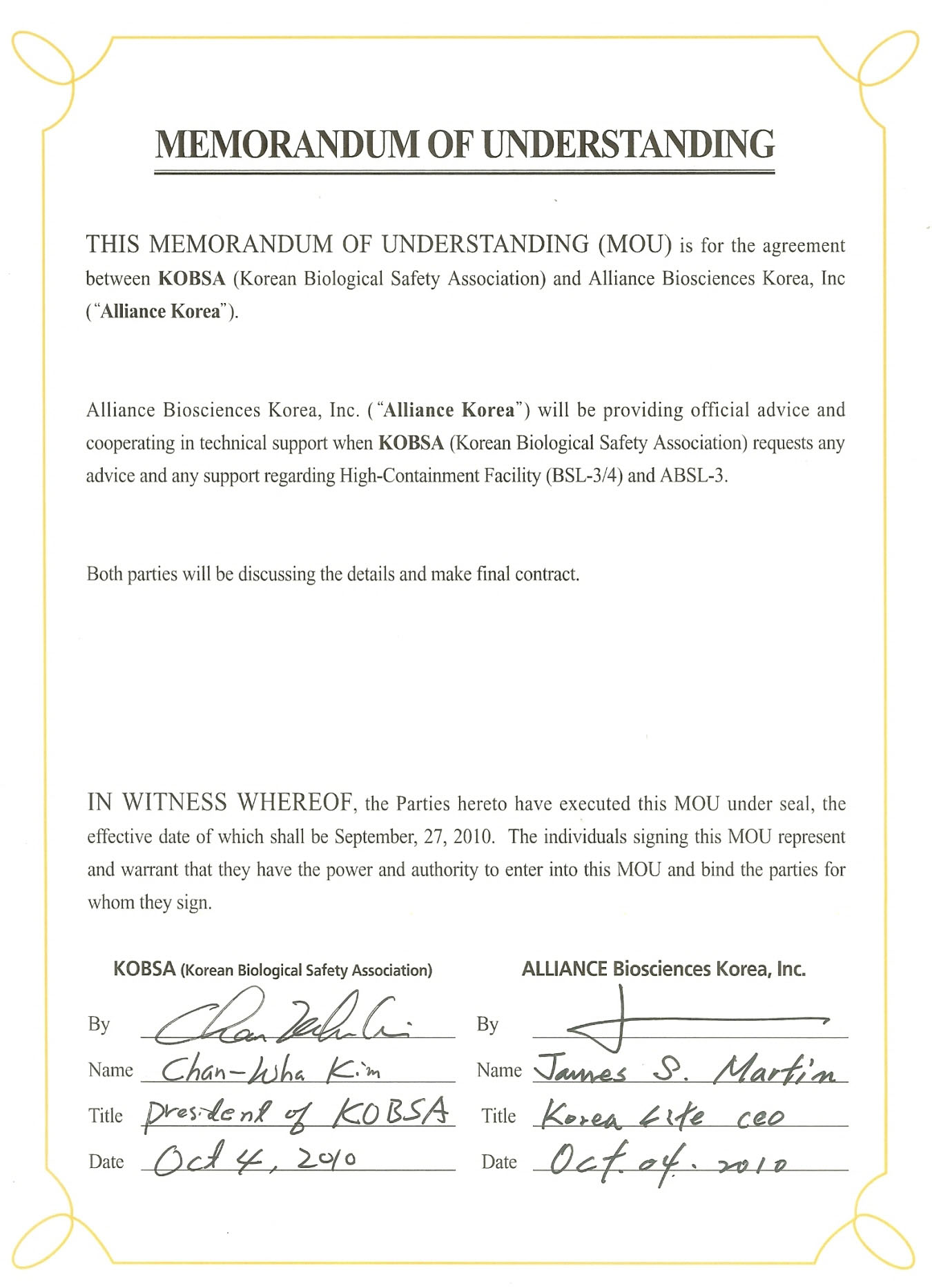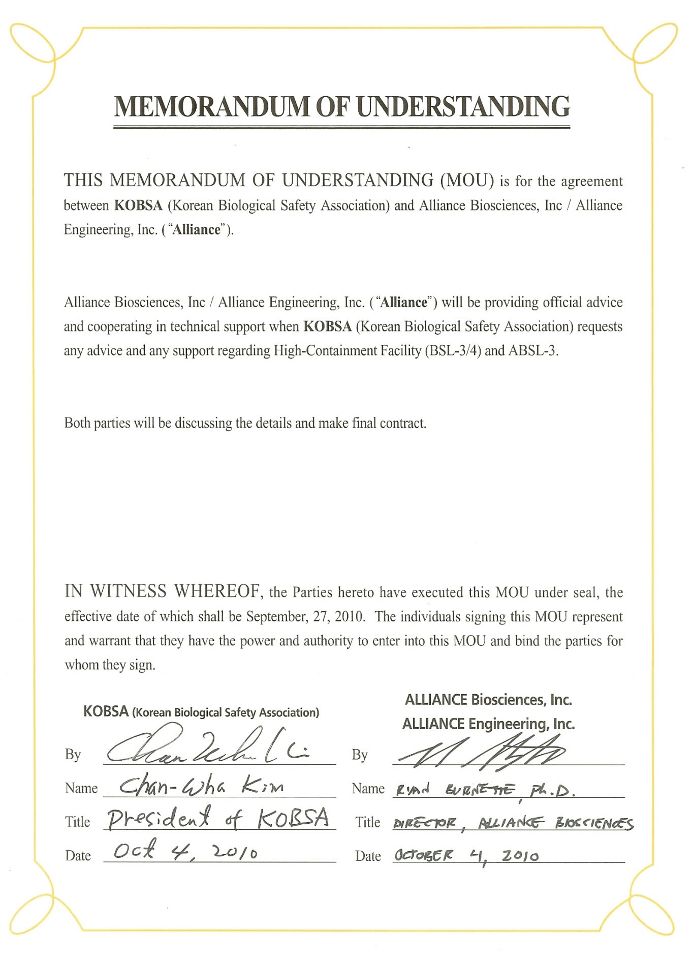 Alliance/Alliance Korea와 한국생물안전협회 MOU 체결.