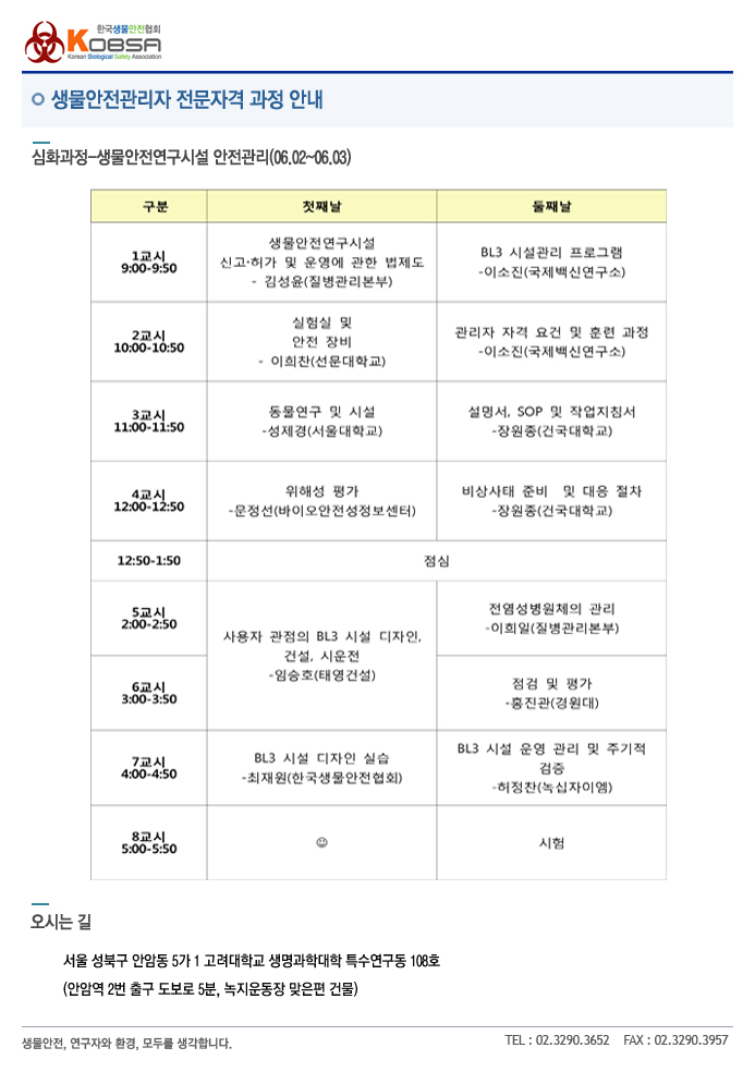 [생물안전관리자 전문자격 - 생물안전연구시설 안전관리] 세부일정 안내. 작성자 KOBSA 조회 4,542 작성일 2011-05-24 돌아오는 6월 2일(목)부터 3일(금)까지 진행되는[생물안전관리자 전문자격-생물안전연구시설 안전관리] 세부일정을 알려드립니다. 오시는 길은 첨부파일을 확인해 주시기 바랍니다. 첨부파일 오시는 길(특수동).hwp 이전글 다음글 목록