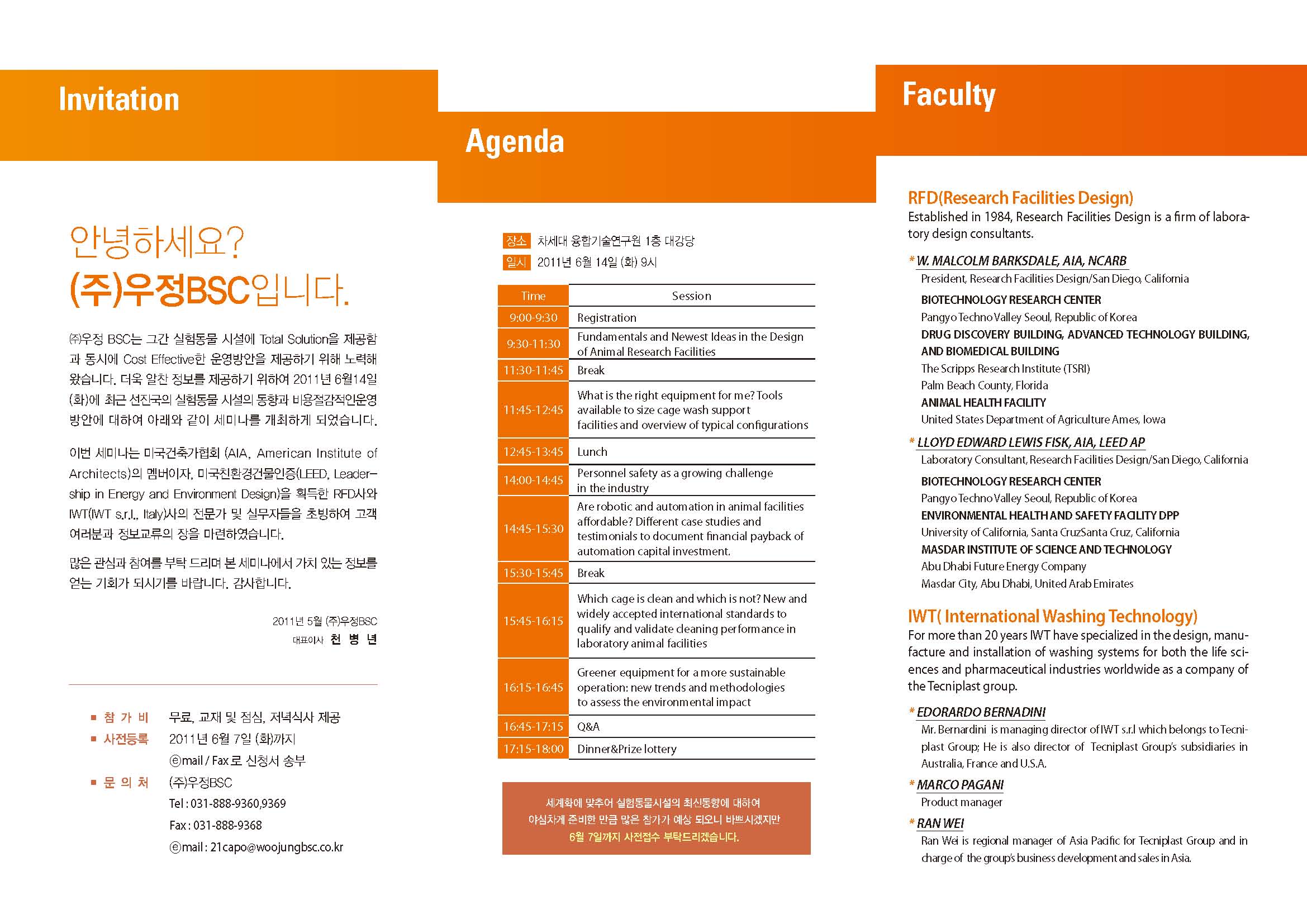 [실험동물시설의 기획과 디자인] 세미나 안내. 작성자 KOBSA 조회 7,368 작성일 2011-05-30 (주)우정BSC에서 [실험동물시설의 기획과 디자인-효율성 증대 및 운용 유지 방안]세미나를 아래와 같이 개최합니다.협회 회원분들의 많은 관심과 참여 바랍니다. 첨부파일 Seminar program20110614.doc우정BSC INVITATION.pdf 이전글 다음글 목록