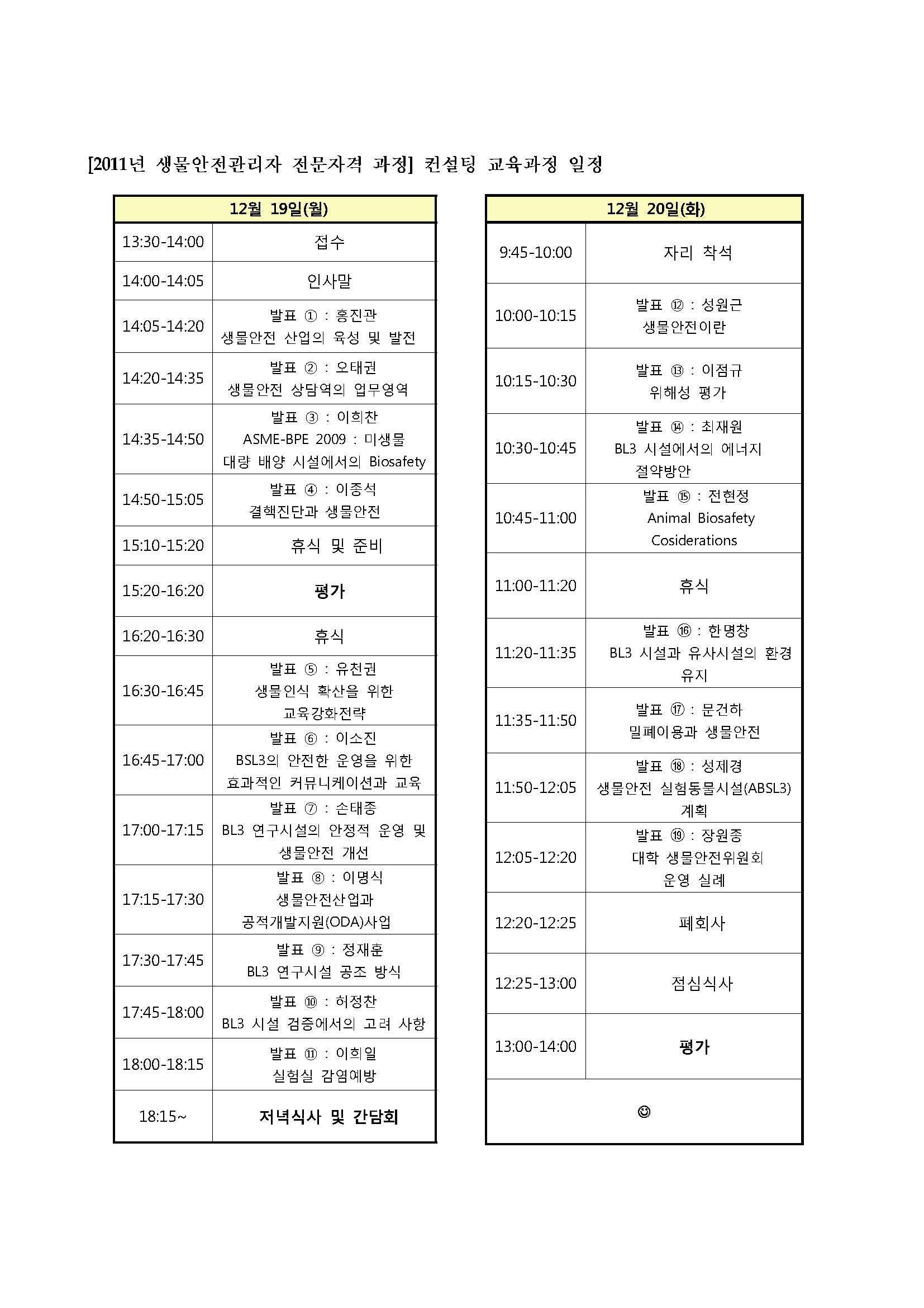 생물안전연구시설 인스팩션 및 컨설팅 교육과정이 12월 19일~12월 20일로