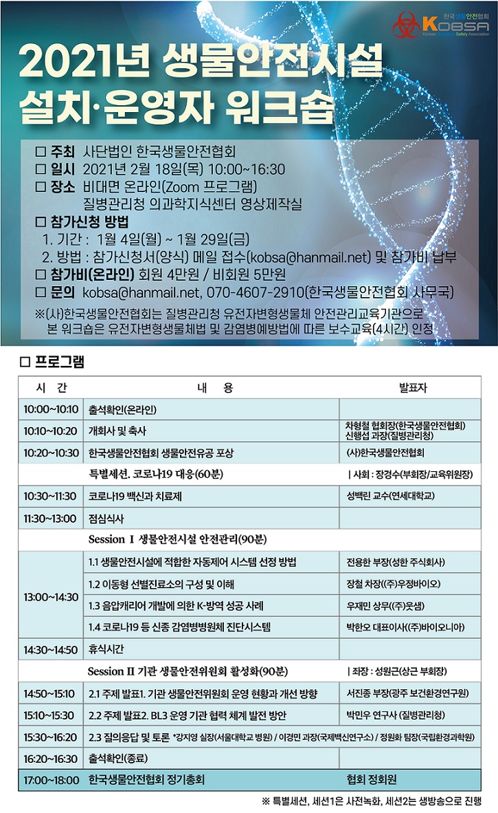 2021년 생물안전시설 설치·운영자 워크숍(비대면) 안내