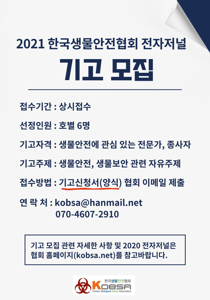 2021년 한국생물안전협회 전자저널 기고 모집 (상시접수)