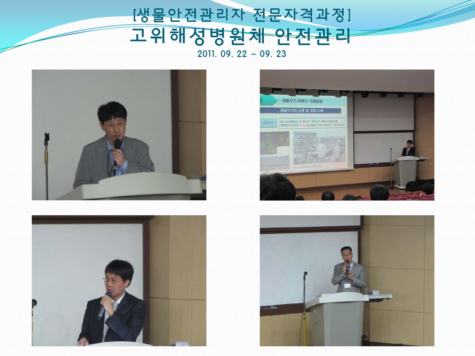 [생물안전관리자 전문자격 : 고위해성병원체 안전관리] 사진 작성자 KOBSA 조회 6,507 작성일 2011-11-23 2011년 9월 22일(목)부터 23일(금)까지 고려대학교 생명과학대학에서 개최되었던 [생물안전관리자 전문자격 : 고위해성병원체 안전관리] 사진입니다. 이전글 다음글 목록