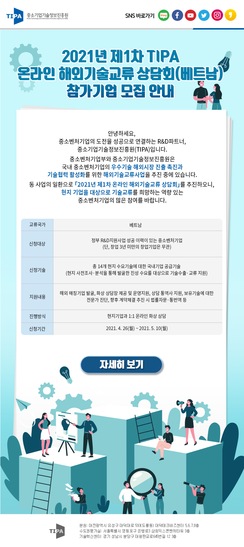 [중소기업기술정보진흥원] 2021년 제1차 TIPA 온라인 해외기술교류 상담회(베트남) 참가기업 모집 안내(~5.10)
