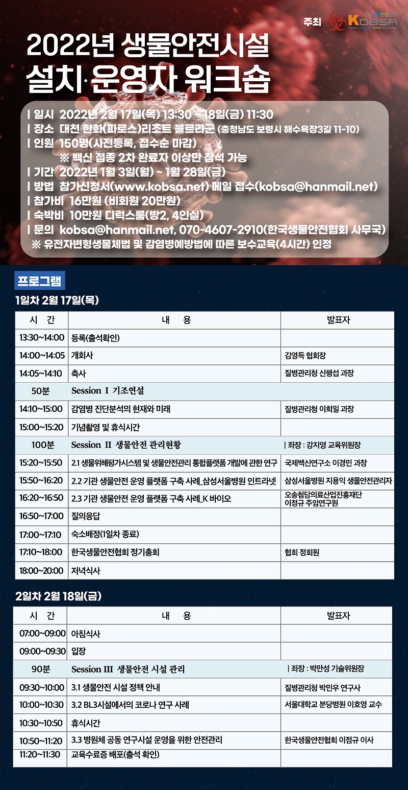 2022년 생물안전시설 설치·운영자 워크숍 안내 (2.17-2.18)