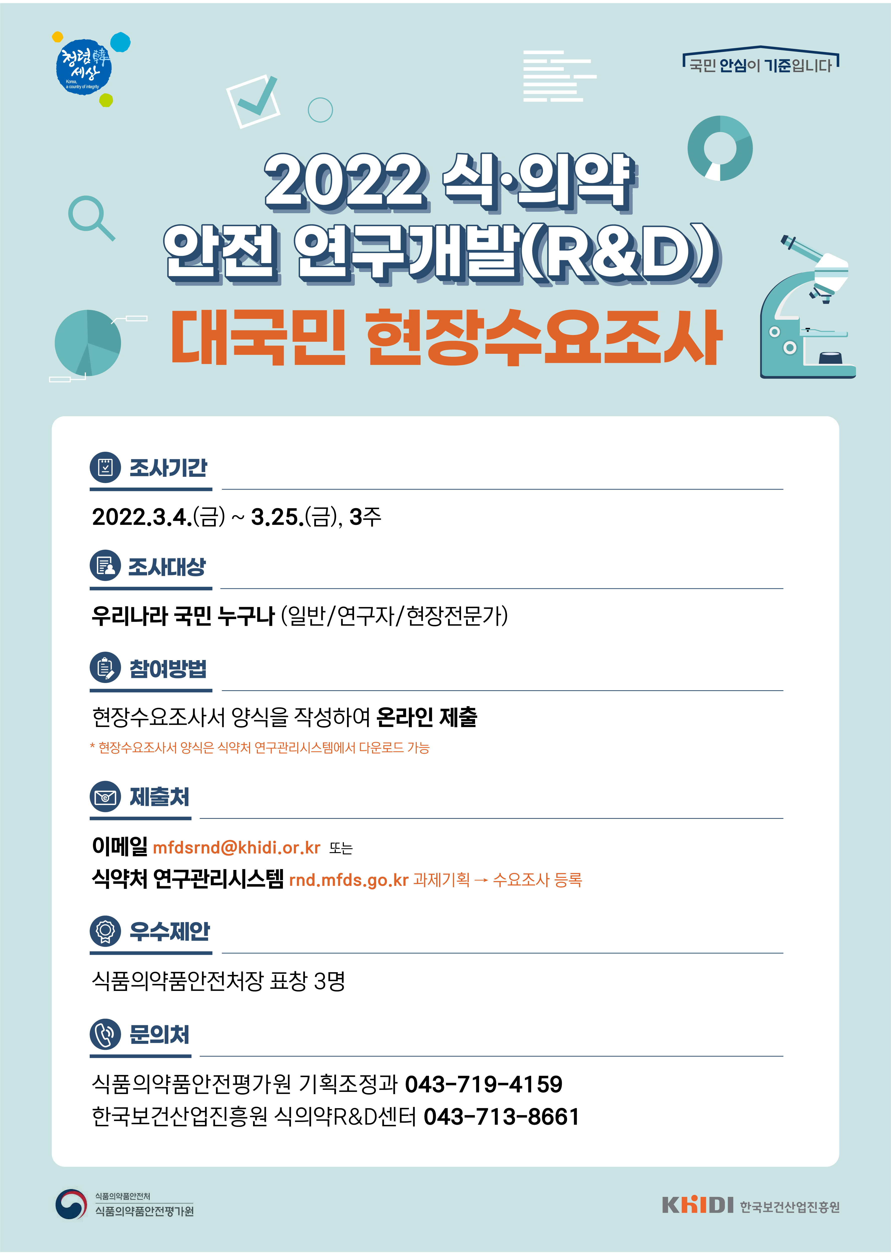 [한국보건산업진흥원] 2022년 식의약RnD 연구개발사업 현장수요조사 실시 알림(2022.3.4.(금) ~ 2022.3.25.(금), 3주간) 작성자 홈페이지 관리자 조회 1,043 작성일 2022-03-18 첨부파일 [공문] 2022년 식의약R&D 연구개발사업 현장수요조사 협조 요청.pdf[붙임] 2022년 식의약 R&D 현장수요조사 추진계획(안).hwp 이전글 다음글 목록
