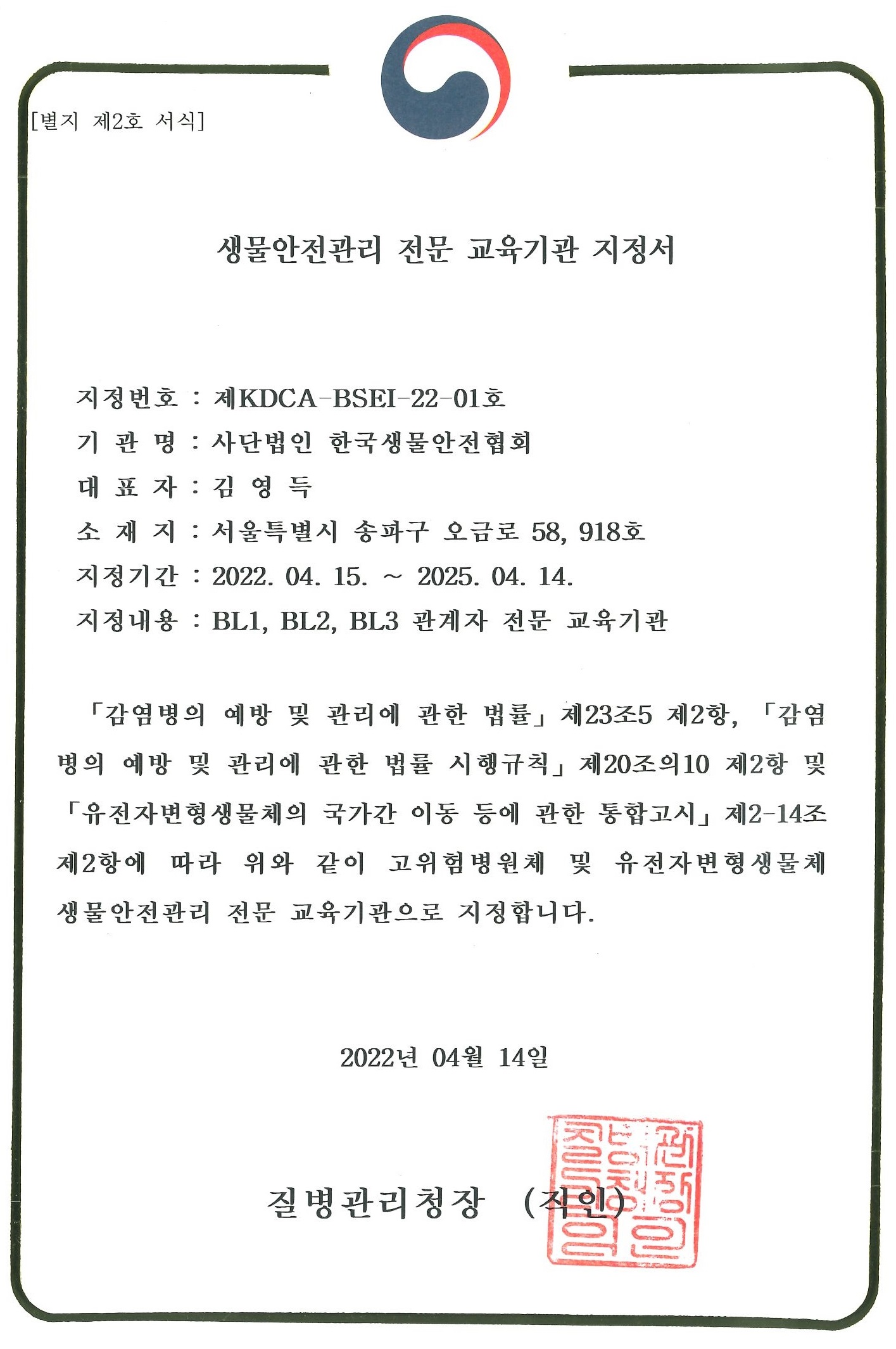 (사)한국생물안전협회, 질병관리청 소관 생물안전관리 전문 교육기관 지정