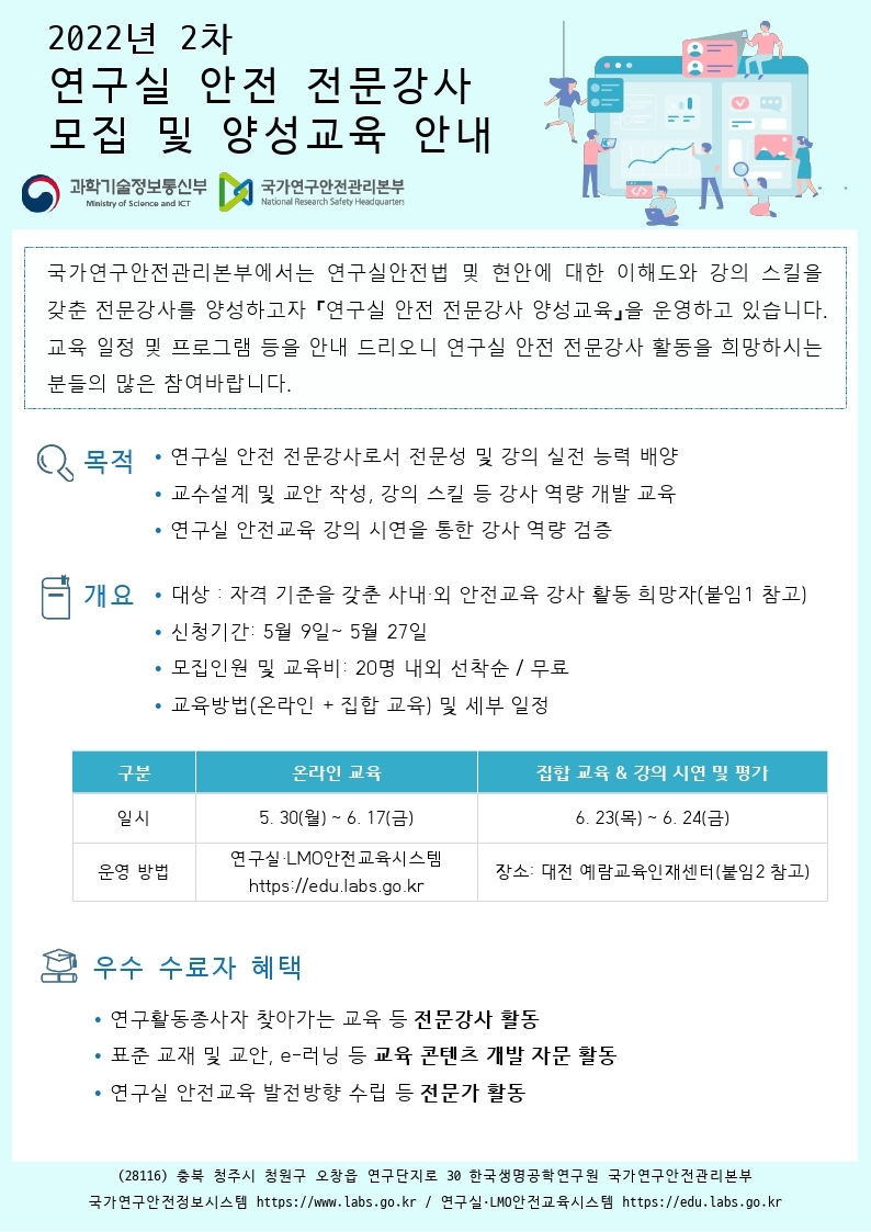 [한국생명공학연구원] 2022년 제2차 연구실안전 전문강사 모집 및 양성교육 신청 안내(~5.27)