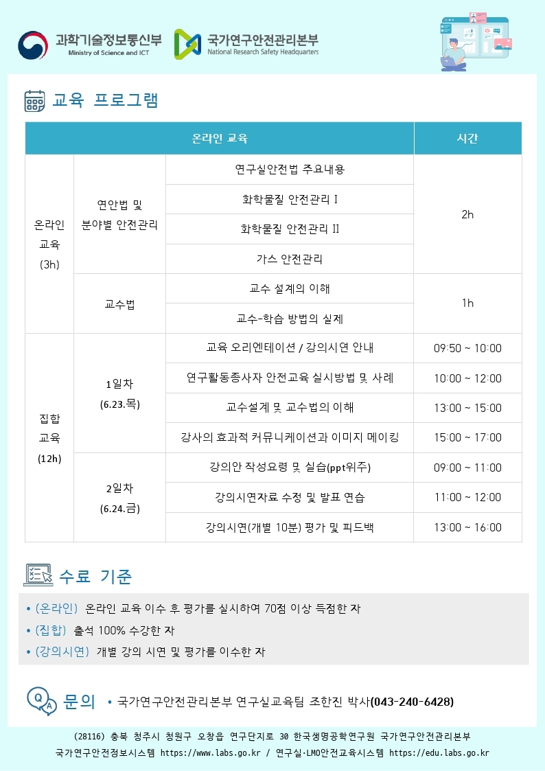 ※ 문의처: 한국생명공학연구원 국가연구안전관리본부 연구실교육팀 조한진 박사(043-240-6428)