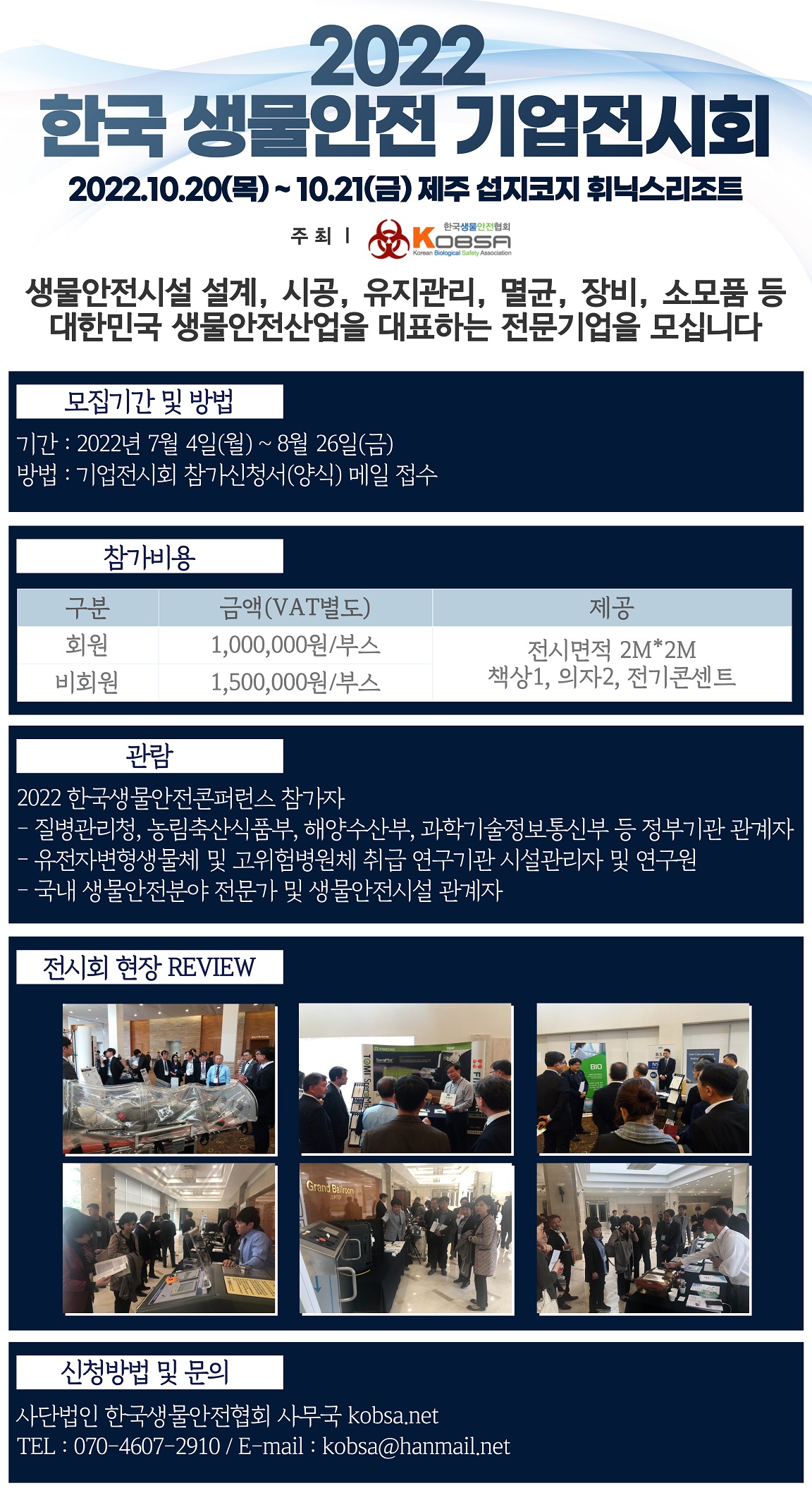 2022 한국 생물안전 기업전시회(10.20 - 21) 개최 안내 (추가 접수 중)