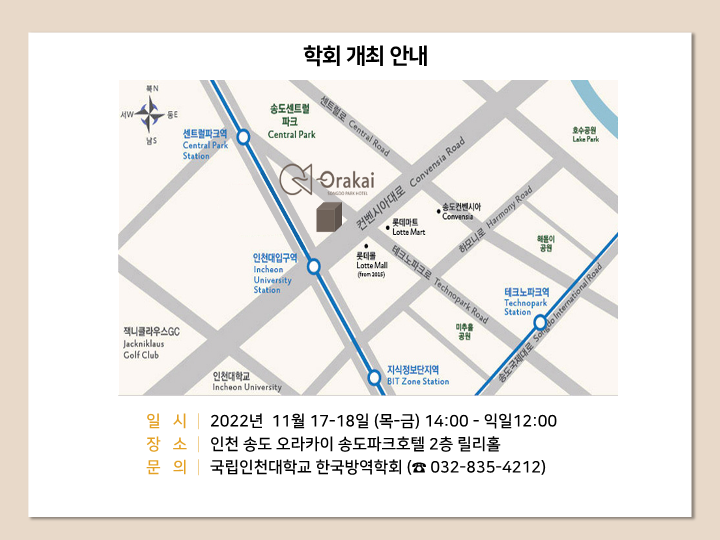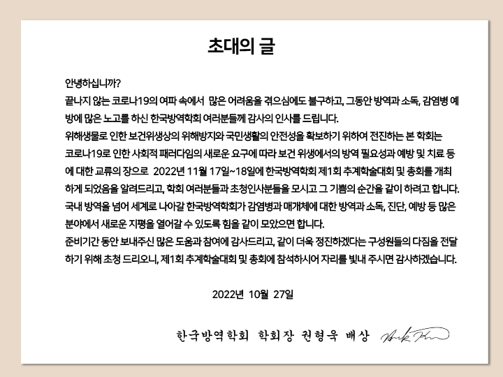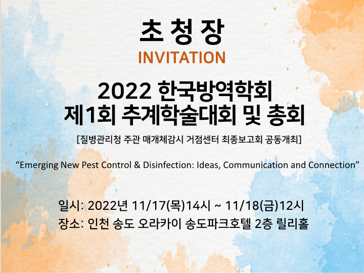 2022년 제1회 한국방역학회 추계학회 개최안내(11.17) 작성자 홈페이지 관리자 조회 761 작성일 2022-11-04 첨부파일 (공문) 2022년 제1회 한국방역학회 추계학회 개최안내.pdf2022 추계학회 숙박신청서.docx2022 한국방역학회 추계학술대회_질병청_최종보고회_프로그램일정.pdf2022 추계학회 한국방역학회 초청장.pdf 이전글 다음글 목록