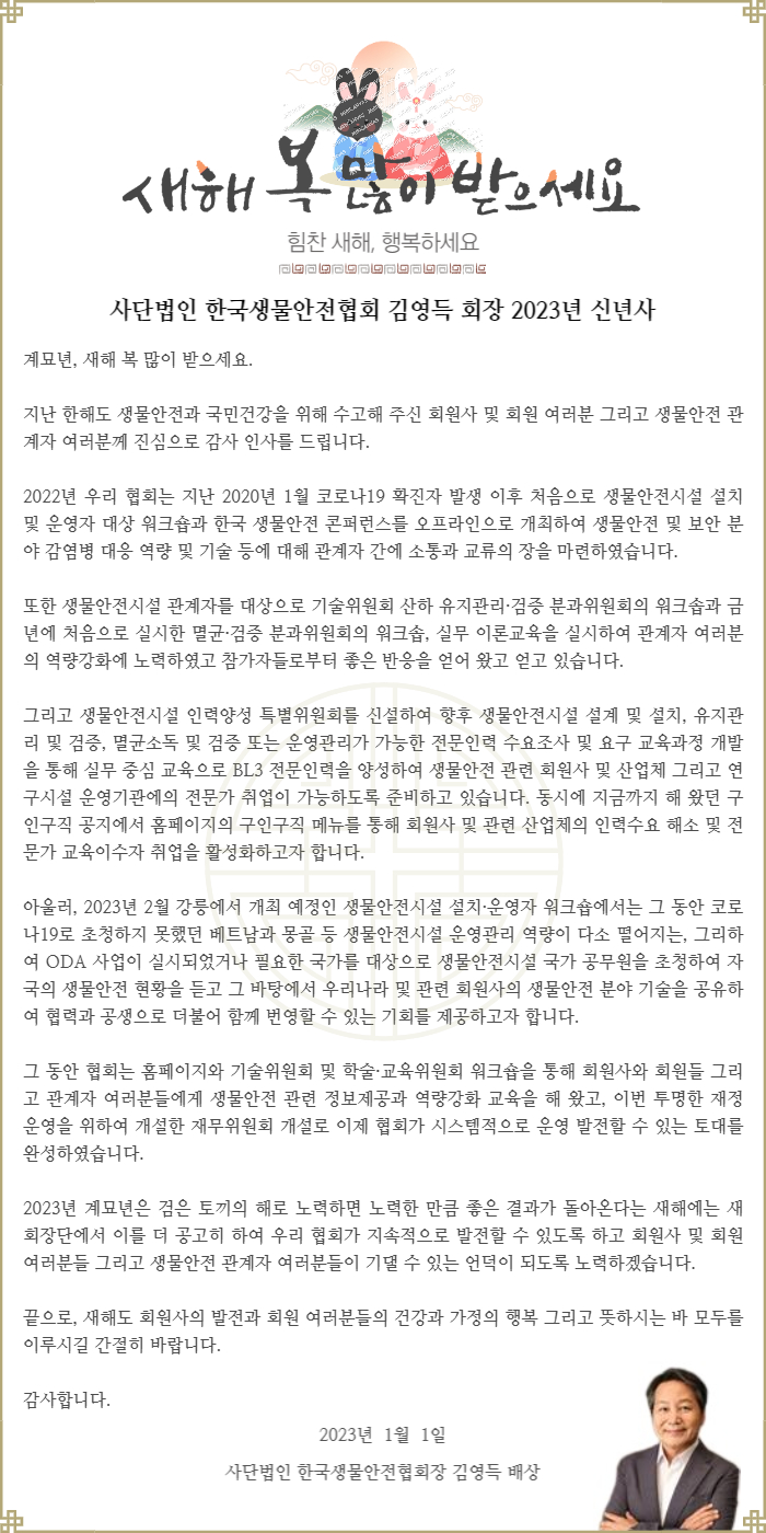 한국생물안전협회 김영득 회장 2023년 신년사