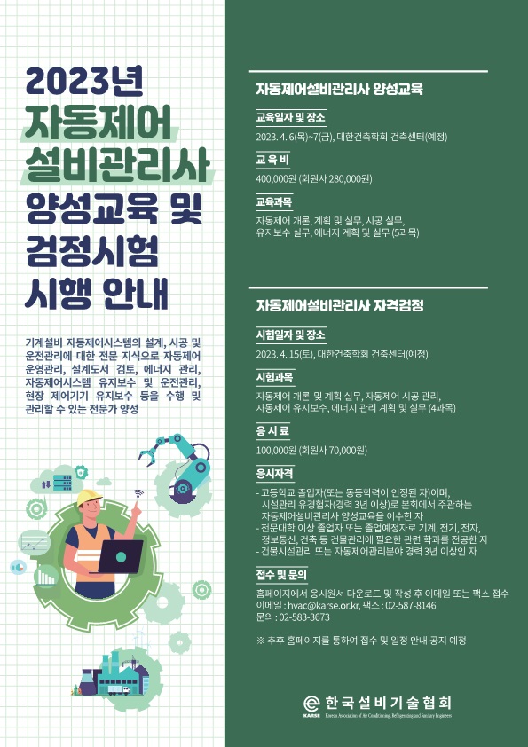 한국설비기술협회 자동제어설비관리사 양성교육 안내입니다.