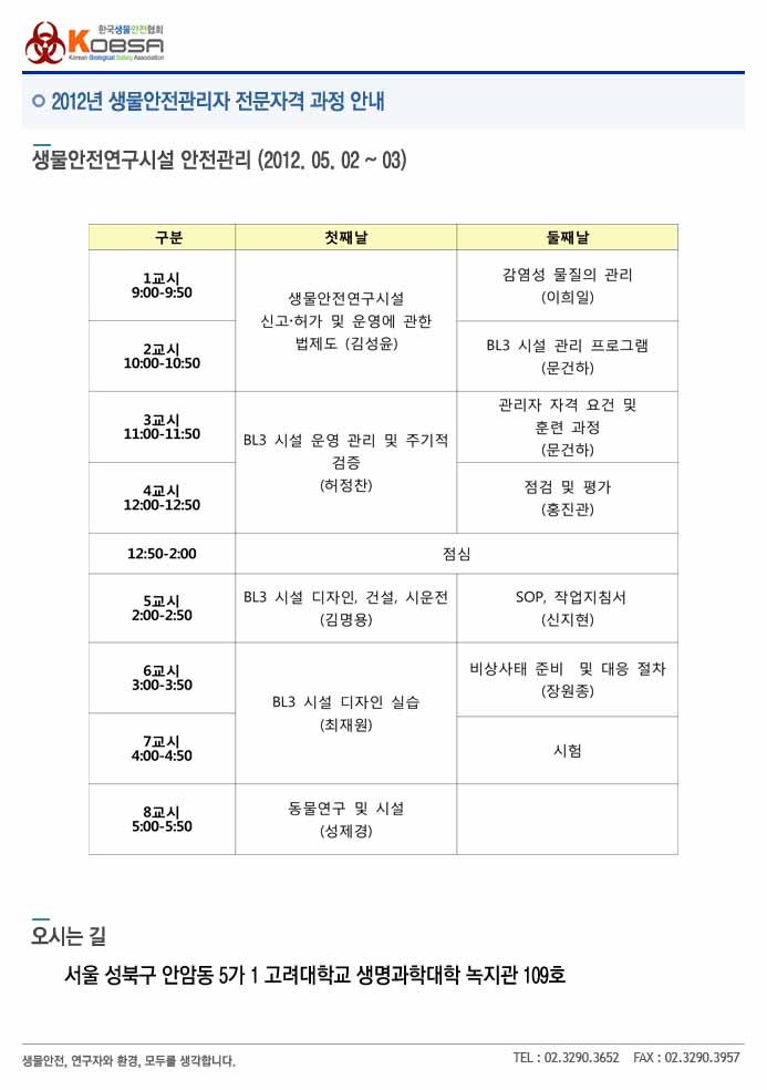 [KOBSA] 심화과정1_생물안전연구시설 안전관리 과정 안내 (2012.05.02~03)