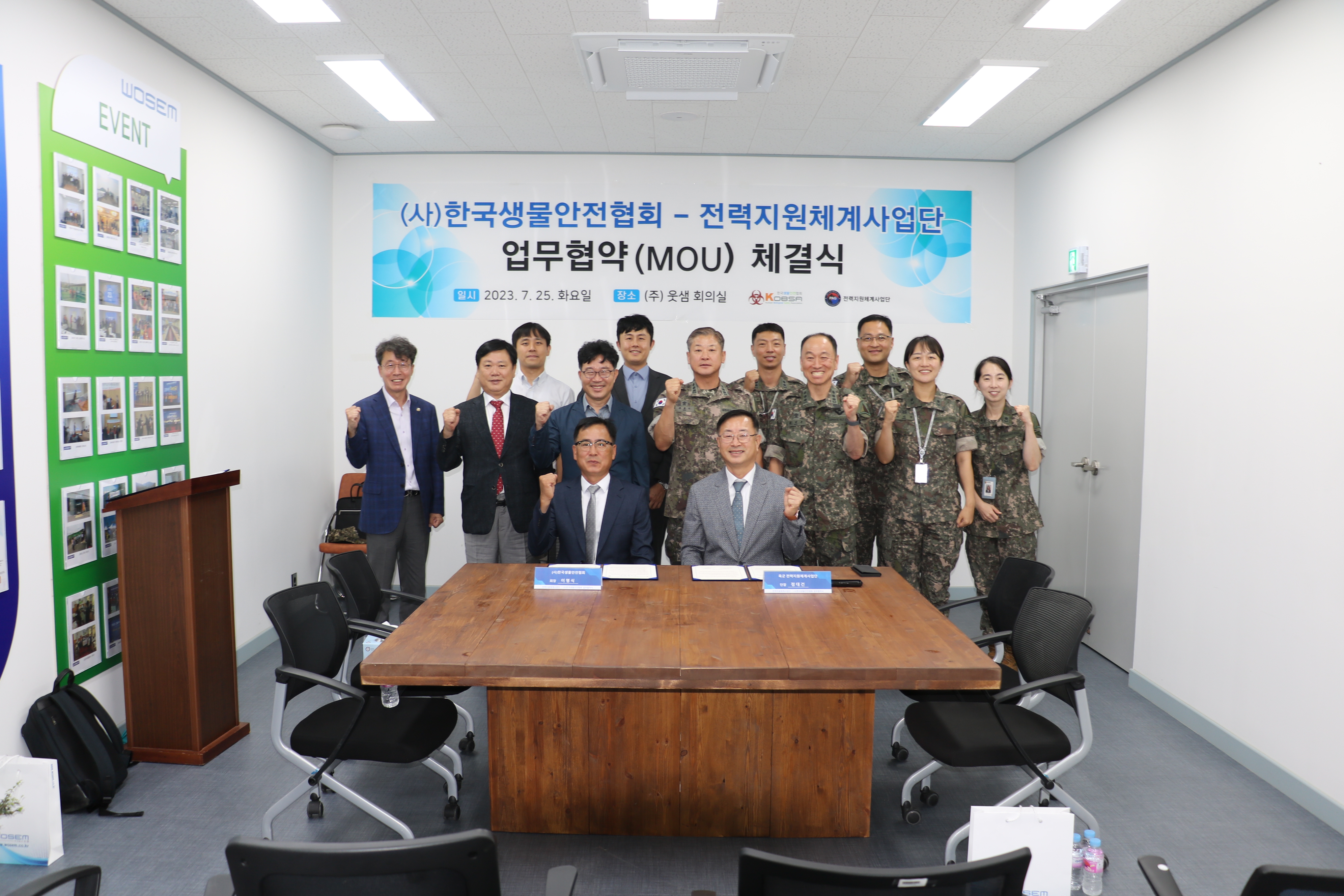 2023.07.25(화) 충북 청주시 옥산면 소재 ㈜웃샘에서(사)한국생물안전협회(회장 이명식)와 육군 전력지원체계사업단(단장 정대건)은 전력지원체계분야 발전 및 효율적인 사업 추진을 위하여 업무협약(MOU) 체결식을 진행하였다. 업무협약식에는 (사)한국생물안전협회 이명식 회장, 장경수 수석부회장, 윤홍익 부회장 등이 참석하였고 전력지원체계사업단에서는 정대건 단장 외 각 부서장 등 10여명이 참석하였다.