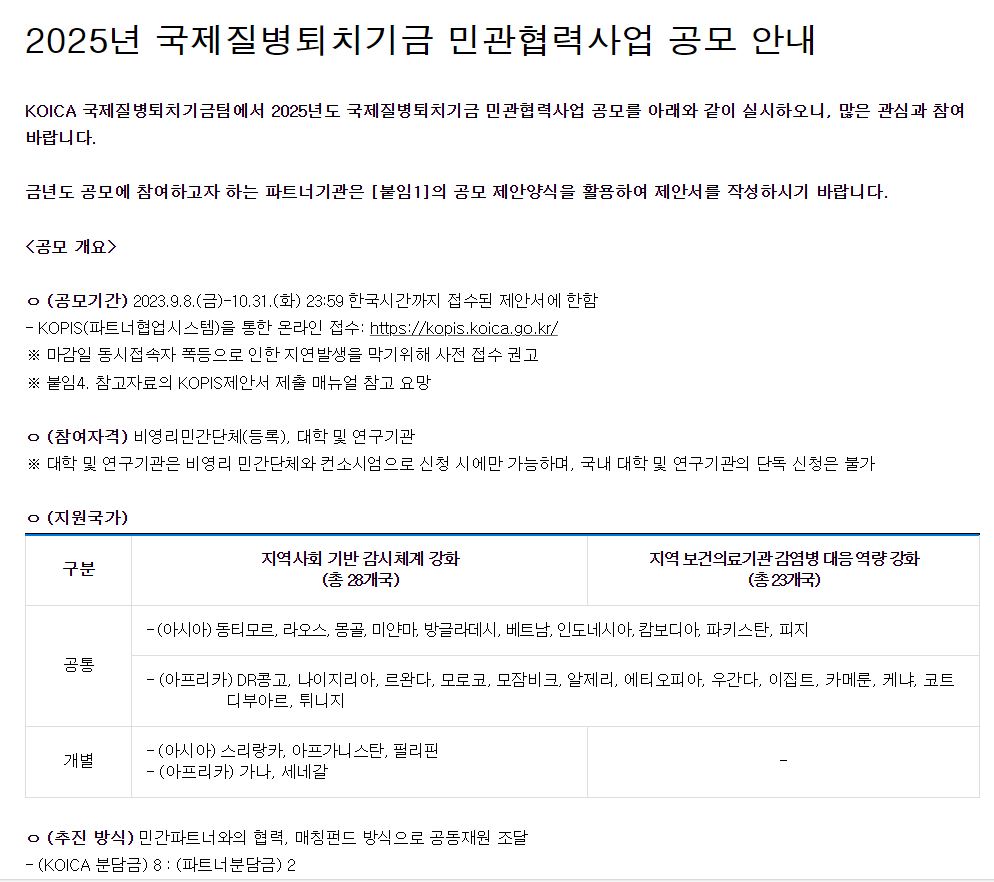 [KOICA] 2025년 국제질병퇴치기금 민관 협력사업 공모 안내(~10.31) 작성자 홈페이지 관리자 조회 984 작성일 2023-10-06 안녕하세요 한국생물안전협회입니다. 2025년 국제질병퇴치기금 민관협력사업 공모 안내입니다. 자세한 내용은 아래 링크를 클릭하여 확인 바랍니다. https://url.kr/2q8nou 감사합니다. 이전글 다음글 목록