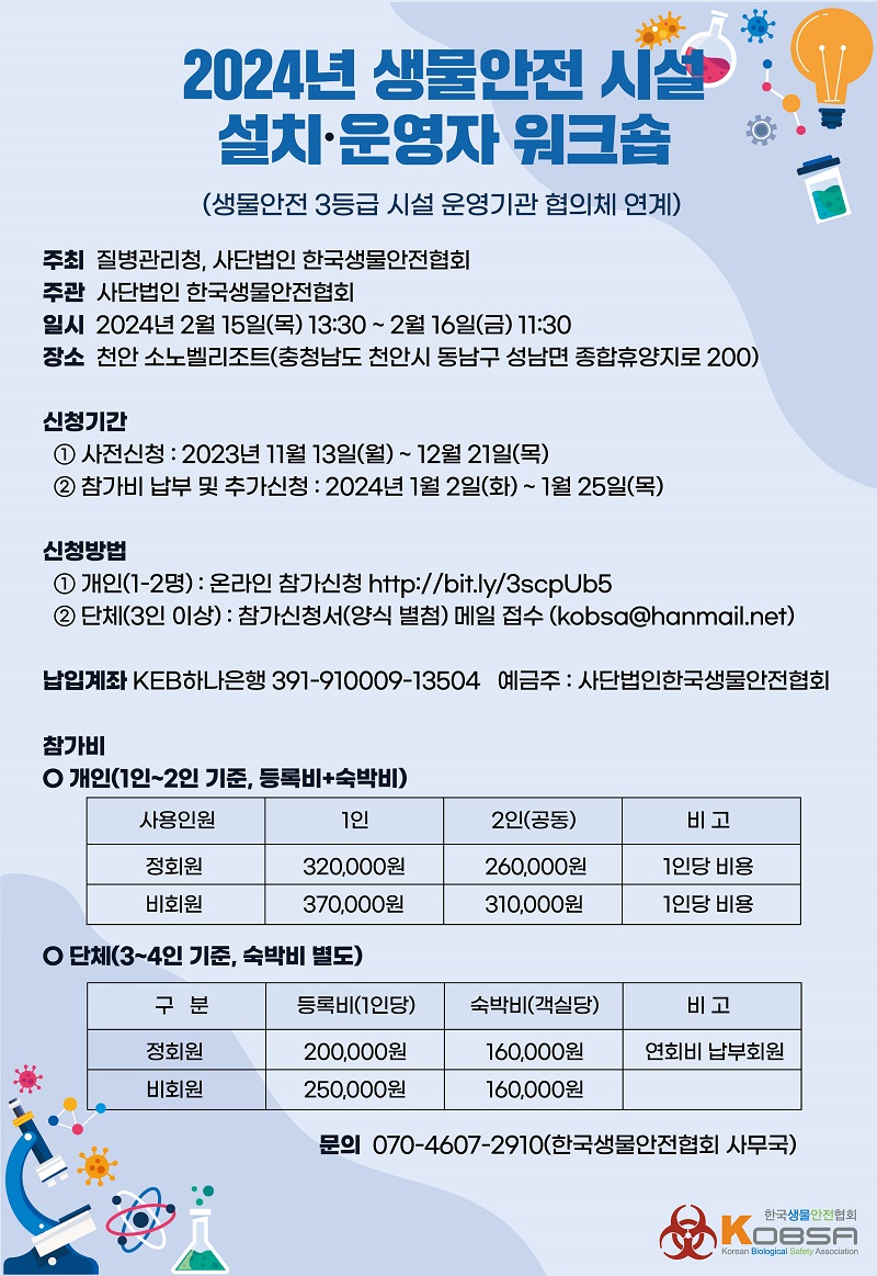 안녕하세요 한국생물안전협회입니다. 2024년 생물안전 시설 설치·운영자 워크숍을 내년 2월 15일(목)~16일(금) 천안 소노벨리조트에서 개최합니다. 2024년 워크숍부터는 질병관리청이 공동주최기관으로 참여하며 '생물안전 3등급 시설 운영기관 협의체 연계'를 함께 진행합니다. □ 일정 : 2024년 2월 15일(목) 13:30 ~ 16일(금) 11:30 □ 장소 : 충청남도 천안시 소노벨리조트 □ 주최 : 질병관리청, 사단법인 한국생물안전협회 □ 주관 : 사단법인 한국생물안전협회 □ 사전신청 : 2023년 11월 13일(월) ~ 12월 21일(목) □ 참가비 납부 및 추가신청 : 2024년 1월 2일(화) ~ 1월 25일(목) ※ 참가비는 2024년 1월 1일 이후 납부 □ 신청방법 : ①개인(1-2명) 온라인 참가신청 http://bit.ly/3scpUb5 ②단체(3인 이상) 참가신청서(양식 첨부) 메일 접수(kobsa@hanmail.net) □ 첨부 : 2024년 생물안전 시설 설치,운영자 워크숍 개최공문, 안내문, 참가신청서(양식) ※ 유전자변형생물체법 및 감염병예방법에 따른 법정(보수)교육 인정 감사합니다.