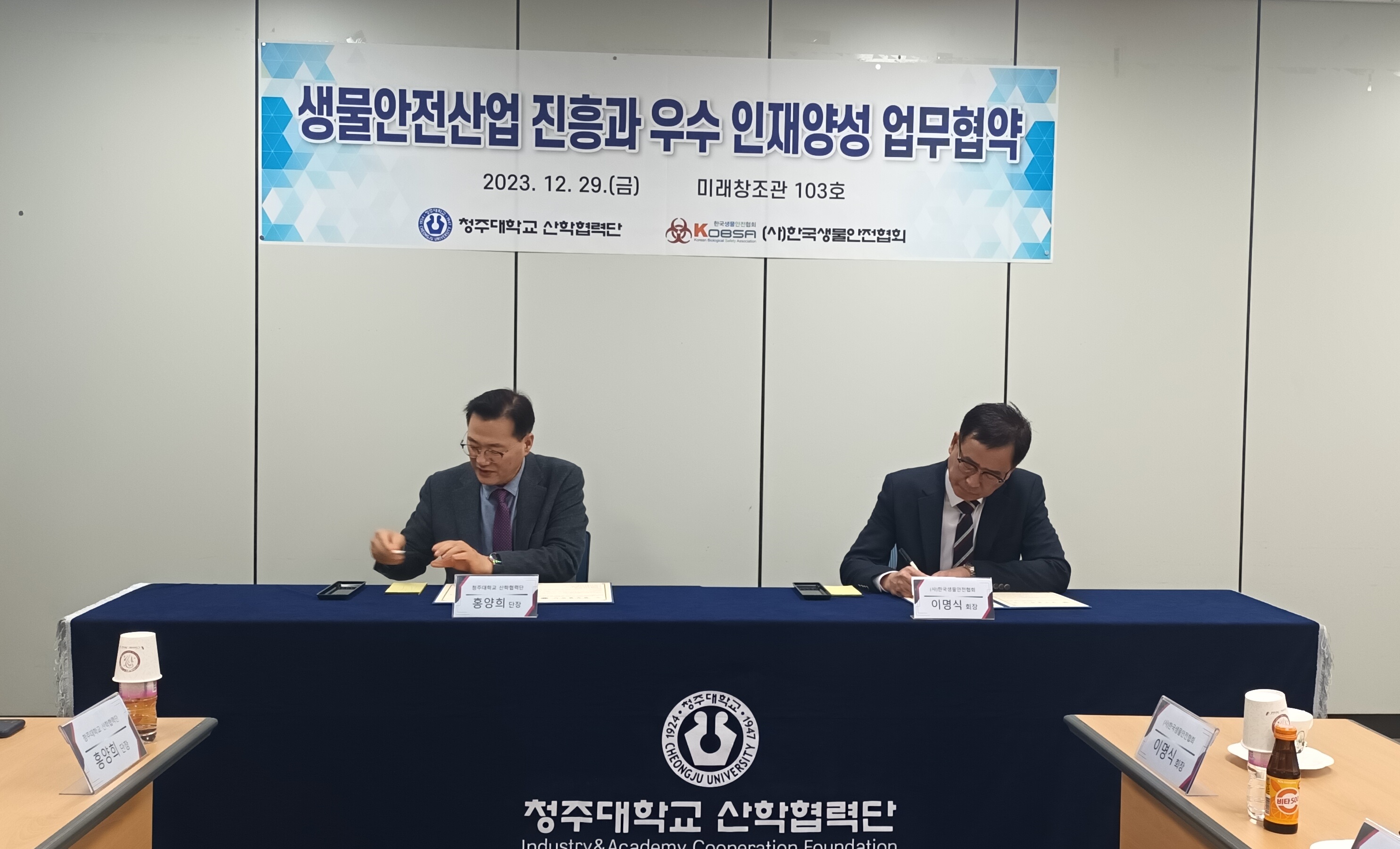 (사)한국생물안전협회(회장 이명식)는 청주대학교(총장 김윤배) 산학협력단과 ‘생물안전산업 진흥과 우수 인재양성 위한 업무협약’ 체결식을 29일 오후 청주대학교 미래창조관에서 진행하였다.