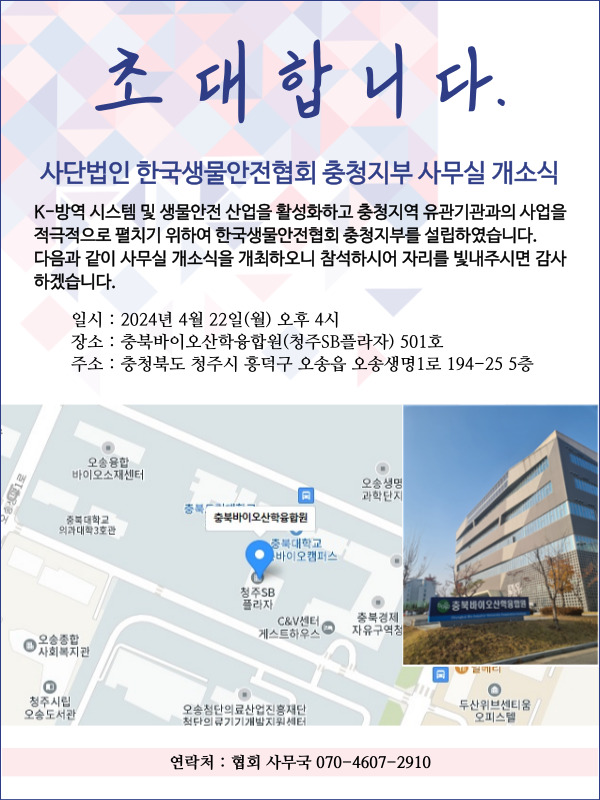 (사)한국생물안전협회 충청지부 개소식(4.22) 안내