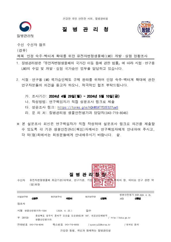 [질병관리청] 인정 숙주-벡터계 확대를 위한 유전자변형생물체(LMO) 개발·실험 현황조사(~5.10) 작성자 홈페이지 관리자 조회 1,256 작성일 2024-04-25 설문조사링크 : https://forms.gle/hQkW5XT7D2E527uw5 첨부파일 [본문] 인정 숙주-벡터계 확대를 위한 유전자변형생물체(LMO) 개발·실험 현황조사.pdf 이전글 다음글 목록