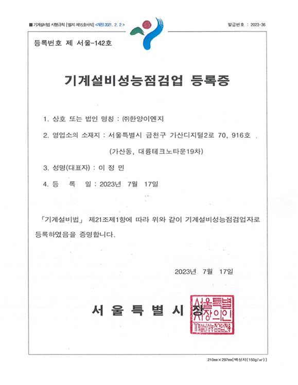 ㈜한양이엔지(www.hanyang-eng.com)에서는 지난 해 7월 기계설비성능점검업을 등록하고 서울시 서북병원 기계설비를 시작으로 건축물에서 기계설비성능점업을 하고 있다.