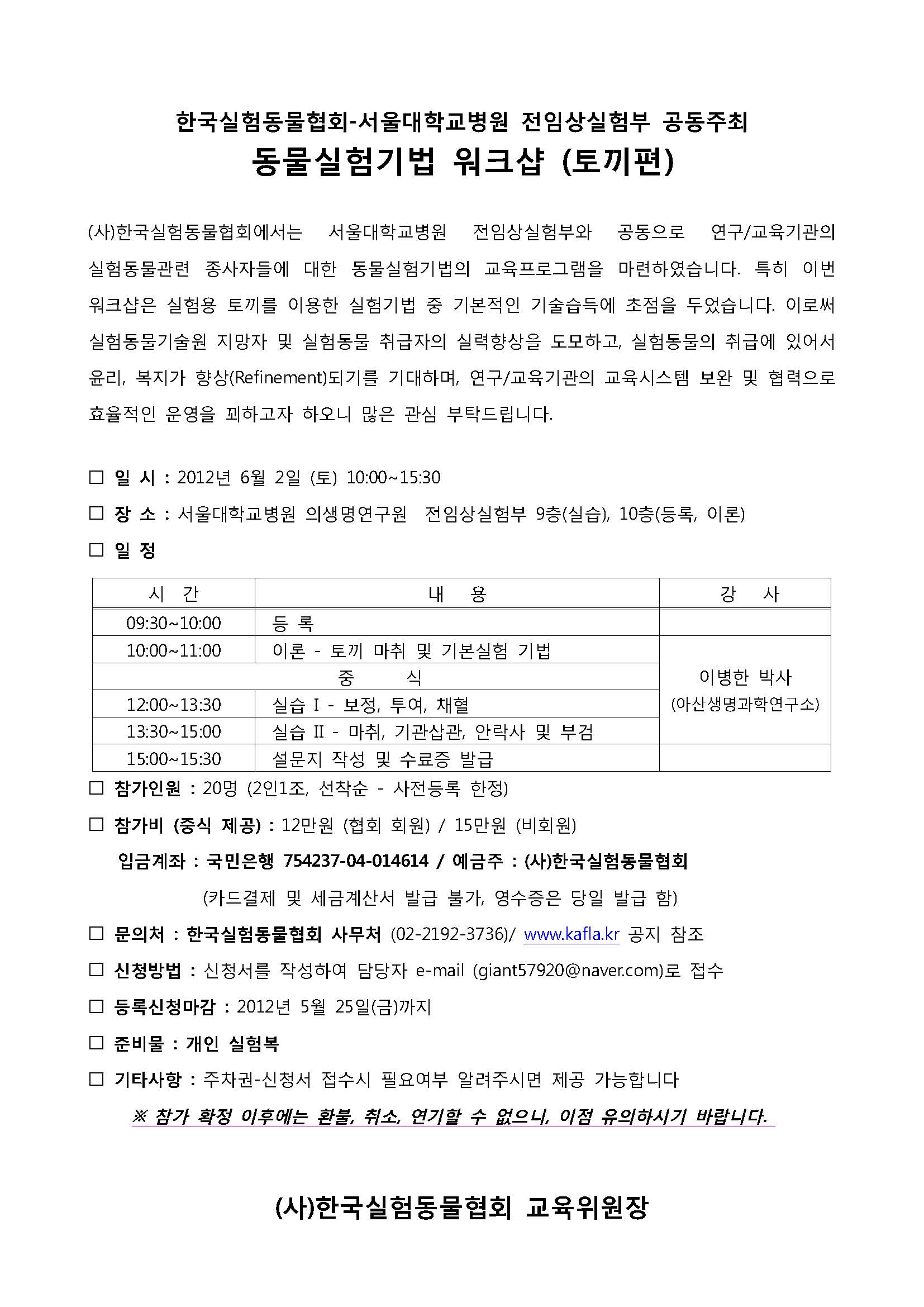동물실험기법 워크샵(토끼편) 관해 안내를 드립니다.