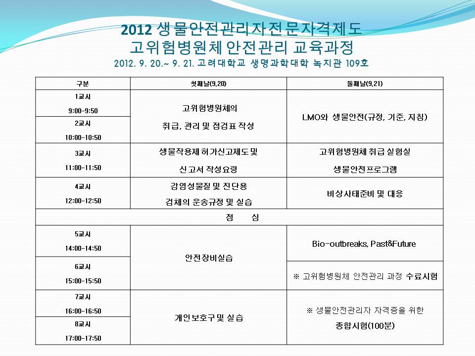 [KOBSA] 2012 고위험병원체 안전관리 교육과정 시간표(9.20~9.21) 작성자 KOBSA 조회 3,415 작성일 2012-08-30 * 일정은 협회 사정에 따라 변경될 수 있습니다. 첨부파일 시간표.jpg 이전글 다음글 목록