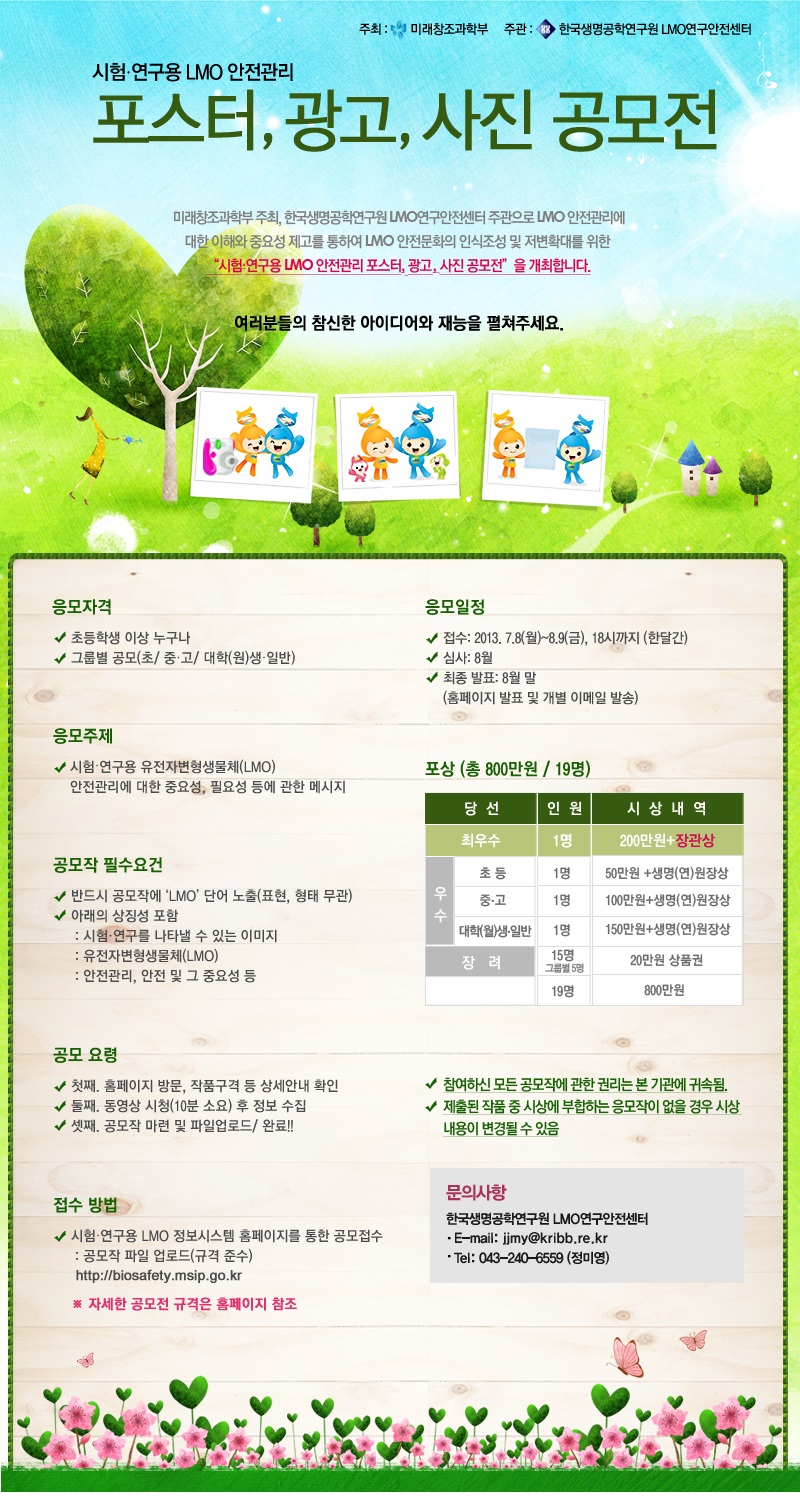 한국생명공학연구원 시험연구용LMO안전관리 포스터, 광고, 사진 공모전 개최 작성자 KOBSA 조회 6,016 작성일 2013-06-26 . 첨부파일 공모전 및 know-How 경연대회 안내문.pdf 이전글 다음글 목록